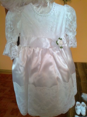 sukieneczka śliczna haftowana długa z atlasem dekorowana różyczkami,perełkami w pasie ma śliczną białą kokardę.