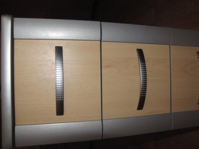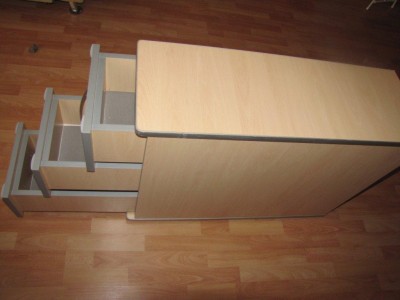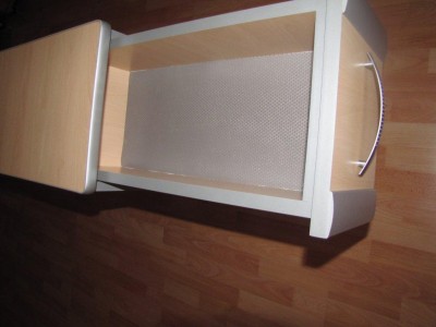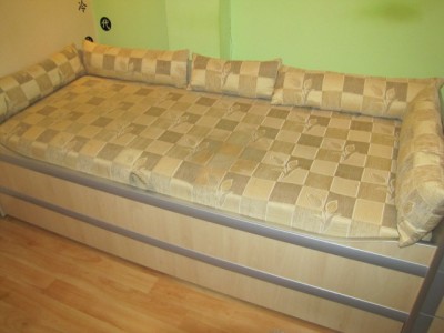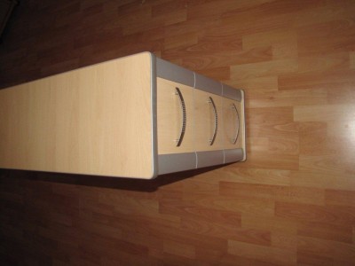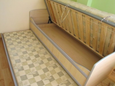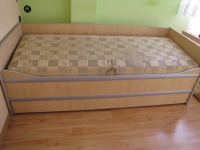 Ta plama, którą widać, to proszę się nią nie przejmować! Żona niemiała czasu tego wyprać, tak więc gwarantuję, że wystarczy zdjąć, włożyć do automatu i po sprawie. Oprócz tego niedawno (około 4-5 miesięcy do tyłu) kupiłem i zamontowałem nowe podnośniki. Ponadto mam także do kompletu szafkę z trzema szufladami. Stała ona przy łóżku, i jest dostosowana do niego (długość, szerokość, wysokość 88x30x67). Zamontowane są tam specjalne prowadnice szuflad, dzięki którym można natychmiast wyciągnąć szuflady na zewnątrz (nie znam się na tym, ale od spodu każdej z nich naciska się na dwa języczki i wtedy szuflada wychodzi z prowadnic). Cena za szafkę - 50 zł.